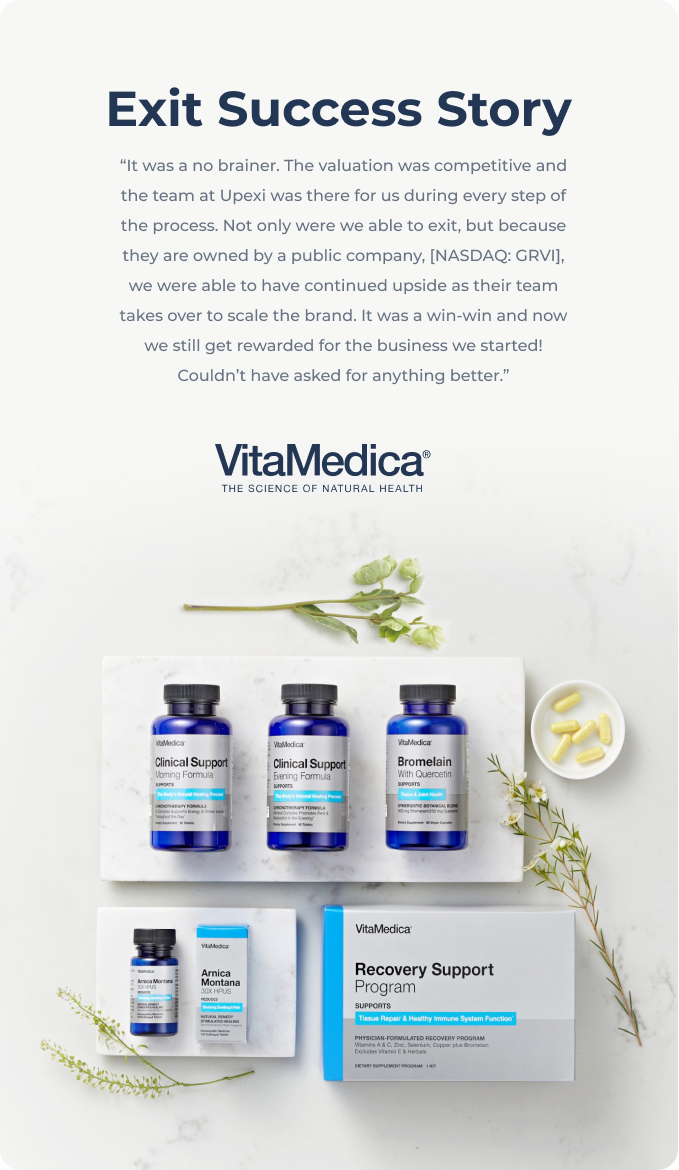 “It was a no brainer. The valuation was competitive and the team at Upexi was there for us during every step of the process. Not only were we able to exit, but because they are owned by a public company, [NASDAQ: GRVI], we were able to have continued upside as their team takes over to scale the brand. It was a win-win and now we still get rewarded for the business we started! Couldn’t have asked for anything better.”